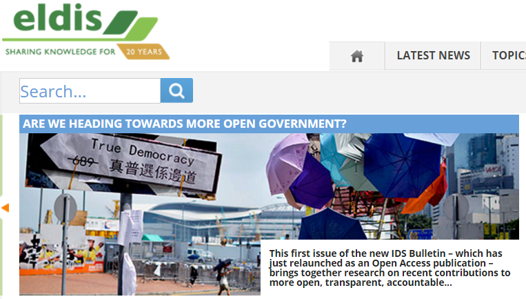Eldis is an online information service providing free access to relevant, up-to-date and diverse research on international development issues. Documents were organized into collections according to key development themes and the country or region they relate to. |